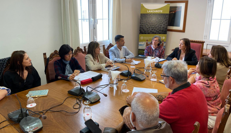 El director general de Infraestructuras y Equipamientos del Gobierno de Canarias, Iván G. Carro, junto con la consejera de Educación del Cabildo de Lanzarote, Ascensión Toledo, mantuvo una reunión técnica con equipos directivos de distintos centros educativos a los que presentó el modelo de zonas de sombra en la isla y en La Graciosa.