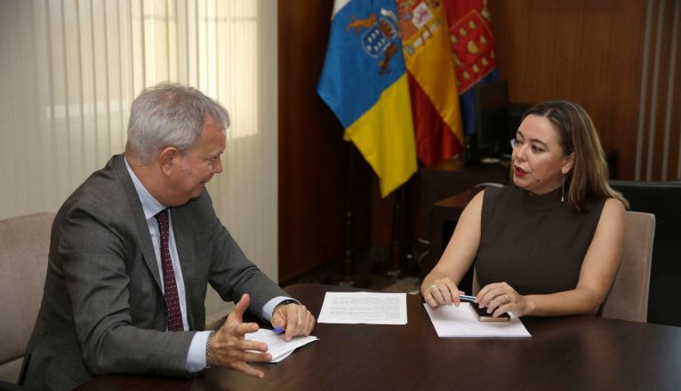 La presidenta del Cabildo de Lanzarote, María Dolores Corujo, recibió este lunes al consejero de Obras Públicas, Transportes y Vivienda del Gobierno de Canarias, Sebastián Franquis, en un acto en el que se confirmó que la Isla será la primera del Archipiélago en conectarse con Madrid en un trayecto sobre el que se aplique una Obligación de Servicio Público (OSP) piloto.