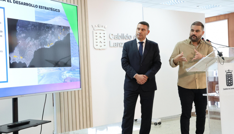 El presidente del Cabildo de Lanzarote, Oswaldo Betancort, acompañado por el consejero de Política Territorial y Ordenación del Territorio, Jesús Machín, ha presentado este lunes los principales ejes estratégicos y los datos más relevantes del Plan Insular de Ordenación de Lanzarote y La Graciosa y del Archipiélago Chinijo (PIOLC), un documento estratégico que sitúa a la sostenibilidad como eje central del desarrollo de la isla.