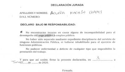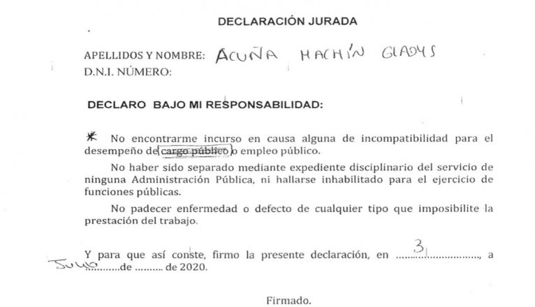 En el documento al que el partido ha tenido acceso "se ve claramente como borran el concepto “incompatibilidad para cargo público” porque estamos ante una condenada por la Justicia", denuncian. "En una supuesta declaración jurada, Gladys argumenta no tener incompatibilidad para realizar las tareas de “Cargo público o empleo público”, únicamente, para evitar que se impidiera la contratación", confirman.