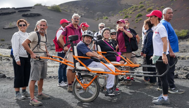 La ruta adaptada se realizó a propuesta del equipo profesional del Parque Nacional de Timanfaya y gracias a la colaboración del Cabildo y al trabajo de un equipo de voluntarios de Cruz Roja, que fueron los asistentes y porteadores de los vehículos.