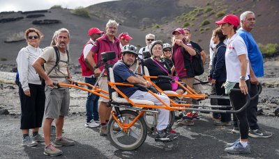 La pasada semana tres personas con diversidad funcional pudieron experimentar por primera vez el contacto directo con el volcán en una salida que se realizó en sillas de ruedas todoterreno (Joëlette).