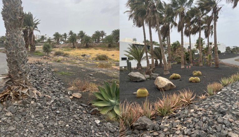 Un lector se ha puesto en contacto con La Voz para mostrar la diferencia del mantenimiento de los jardines que están situados en el cauce del Barranco del Hurón, en Costa Teguise.