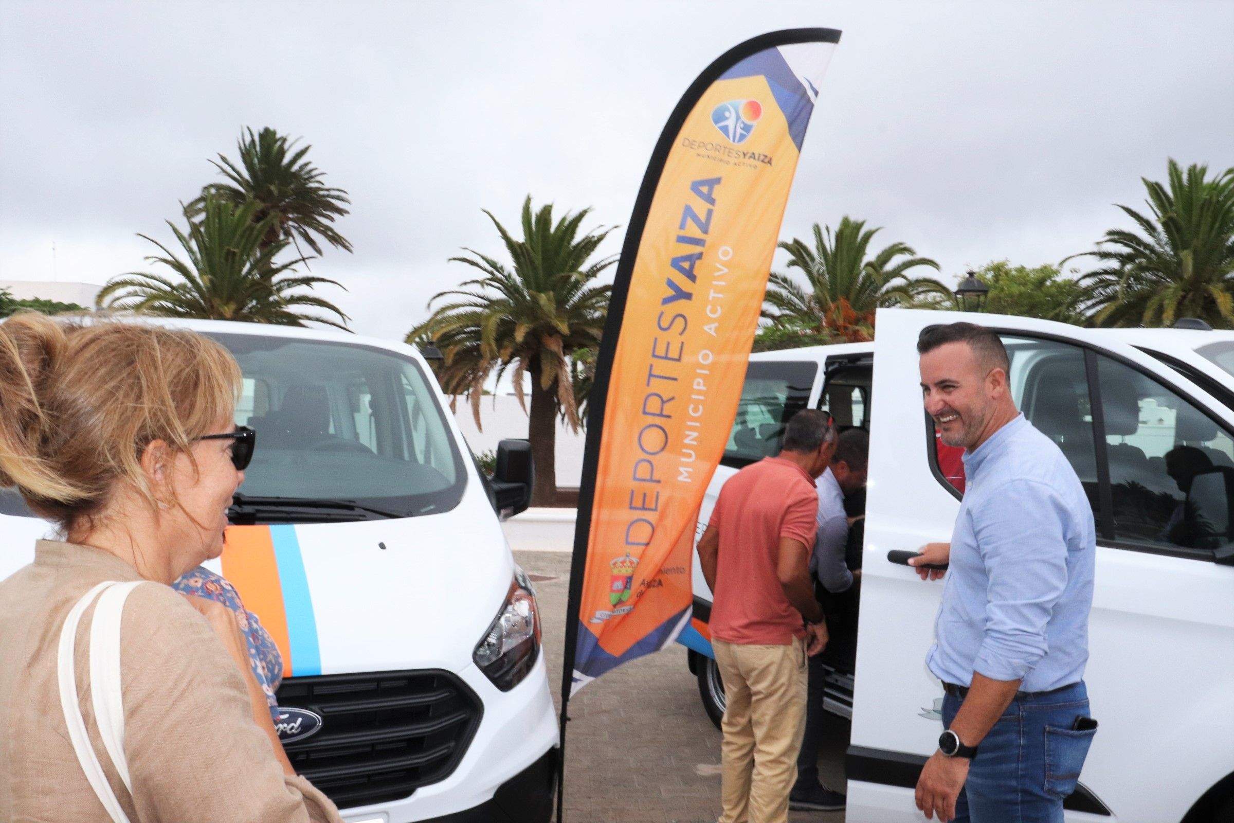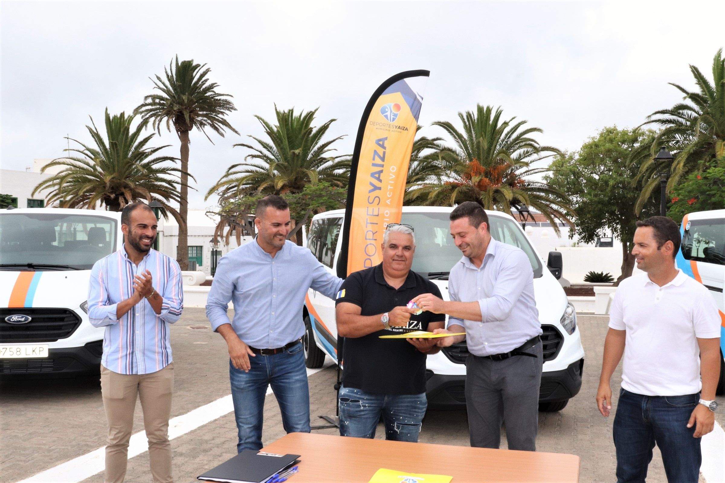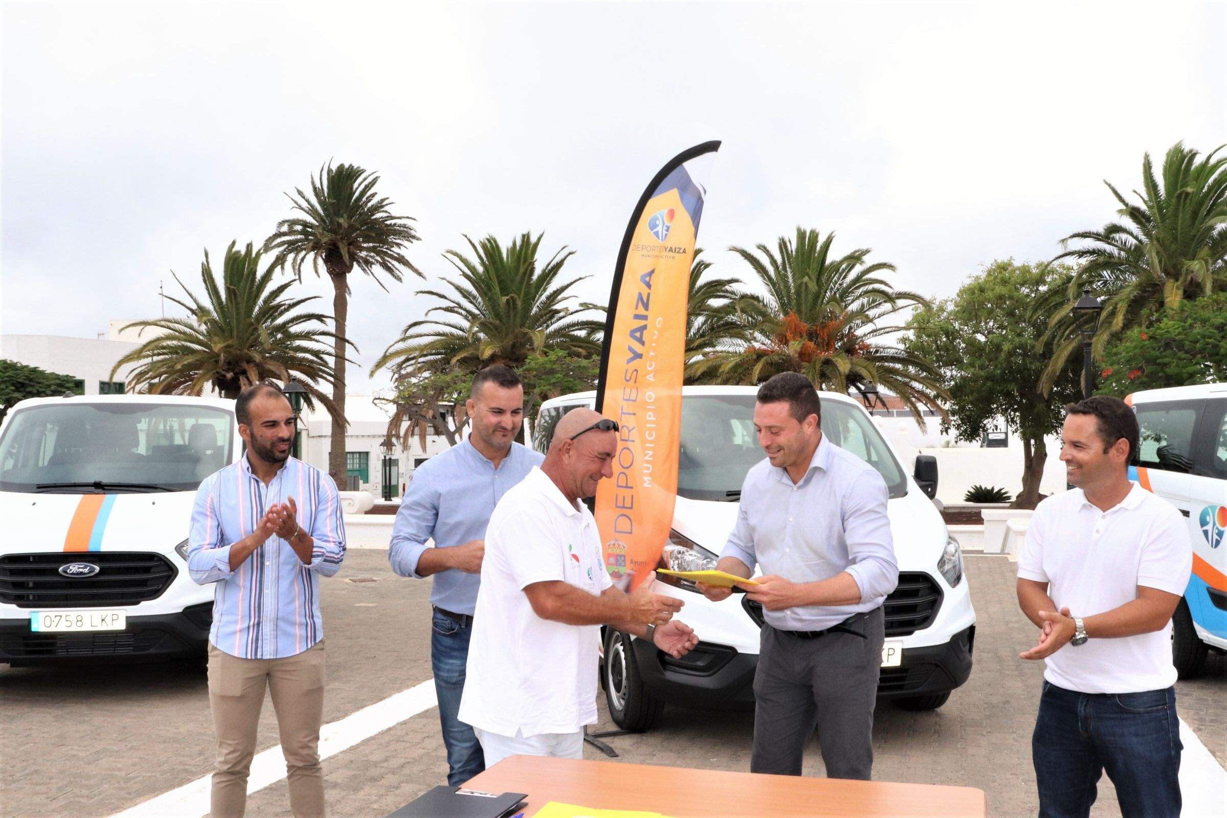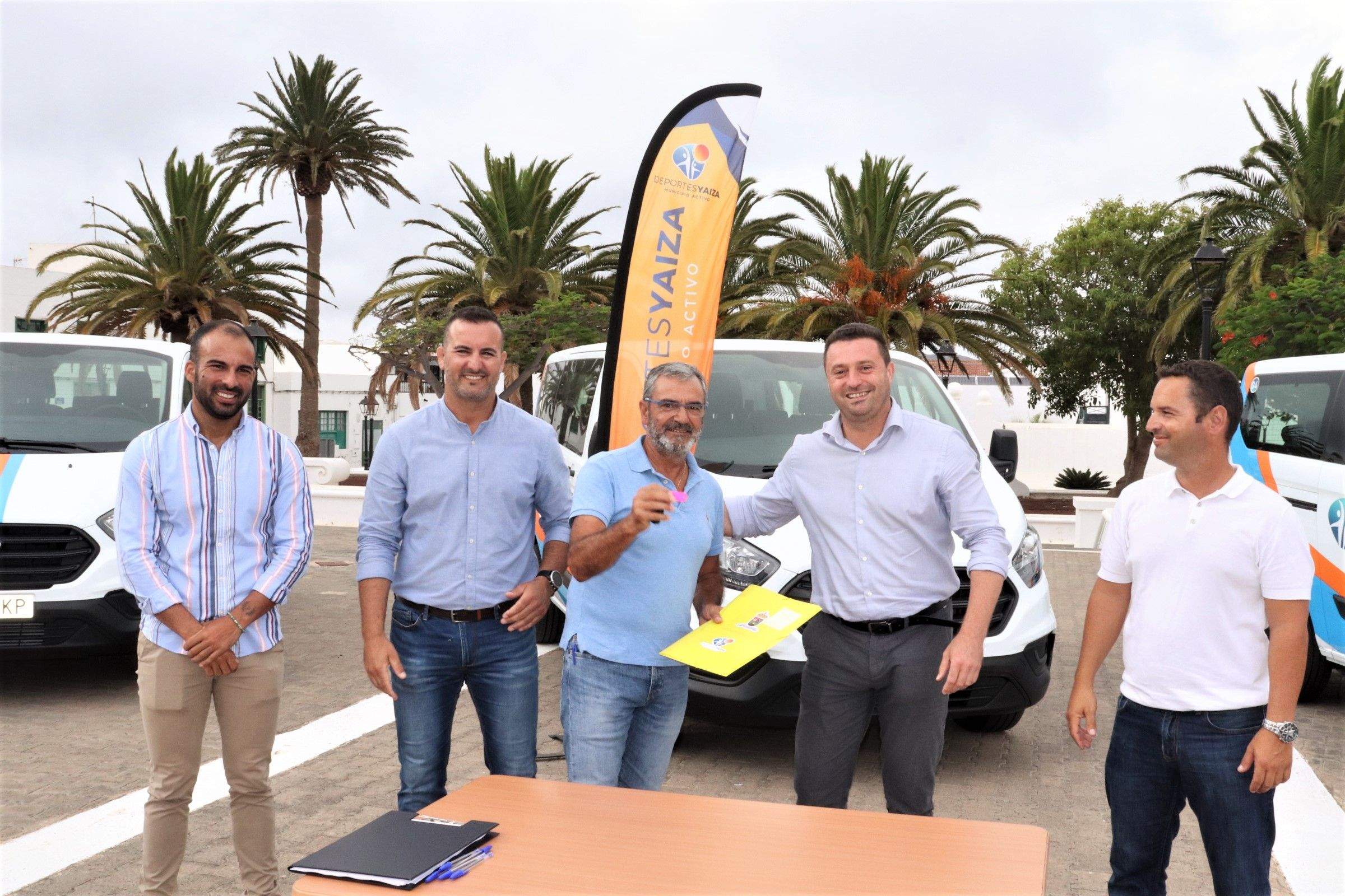 El alcalde de Yaiza, Óscar Noda, y el concejal de Deportes, Ángel Lago, entregaron este lunes los primeros cuatro vehículos a estrenar de nueve plazas destinados a entidades deportivas, con el objetivo de “facilitar el transporte de chicos y chicas de clubes vinculados al programa de escuelas deportivas municipales”.