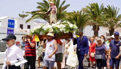 La jornada de cierre comenzó con la misa en honor a la patrona, que contó con la participación de la cantante Iris del Mar. A continuación, se celebró la tradicional procesión marítima y terrestre, acompañada por la banda municipal de San Bartolomé, que recorrió tanto las calles como el litoral de Arrieta.