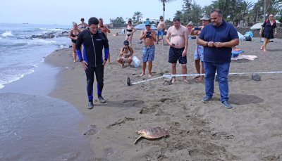 El consejero de Medio Ambiente, Samuel Martín, explica que se trata de una tortuga que ha pasado el proceso veterinario y ha estado recuperándose en el acuario de Costa Teguise para ser devuelta a su hábitat natural. “Seguimos teniendo todavía otras nueve tortugas que han sido rescatadas”, añade.