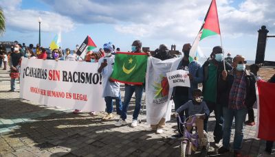 Aproximadamente doscientas personas, se han concentrado en la mañana del 28 de noviembre, junto a la entrada del Puente de las Bolas de Arrecife, bajo el Lema: ¡Canarias sin racismo!, ningún ser humano es ilegal.
