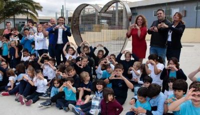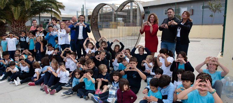 El alcalde de Teguise, Oswaldo Betancort, junto a sus compañeros de grupo de Gobierno, acompañó a los alumnos de Infantil de 3 años y de 2º y 5º de Primaria del centro educativo, en la inauguración de esta obra que, según su autor, "se transformará día a día, ya que los colores y formas de las tapas recogidas rellenarán el interior del corazón solidario".