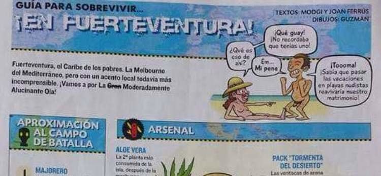 Es concretamente en la última página donde se dedica un espacio a la isla majorera, con textos y viñetas firmadas por Modgi y Joan Ferrús. En su comunicado, el Cabildo critica que se refieran a Fuerteventura como "el Caribe de los pobres", que "se mofen del acento de la población majorera, del gentilicio" y que afirmen que el transporte público "pasa cada 75 años". También cuestiona que denominen "corralitos majoreros" a los semicírculos de piedras que hay en algunas playas de la isla "para que los bañistas se puedan proteger del viento mientras toman sol y que para esta revista son madrigueras sexuales".