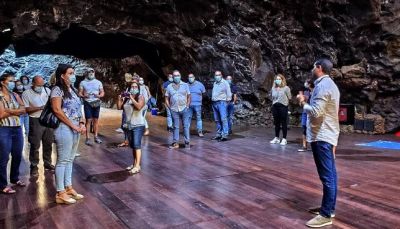 El consejero delegado de los Centros de Arte, Cultura y Turismo, Benjamín Perdomo, ha ejercido de anfitrión del grupo de agentes y operadores turísticos que ha participado en Insólita-Jameos del Agua, uno de los tres nuevos productos Premium con los que la entidad quiere atraer el interés de visitantes con ganas de vivir nuevas experiencias en los espacios creados por César Manrique.
