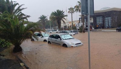 Las lluvias caídas a lo largo de este sábado en Lanzarote ha provocado el caos en Costa Teguise. El agua que bajaba de los barrancos ha anegado las carreteras dejando a coches y guaguas inmovilizados en las vías.