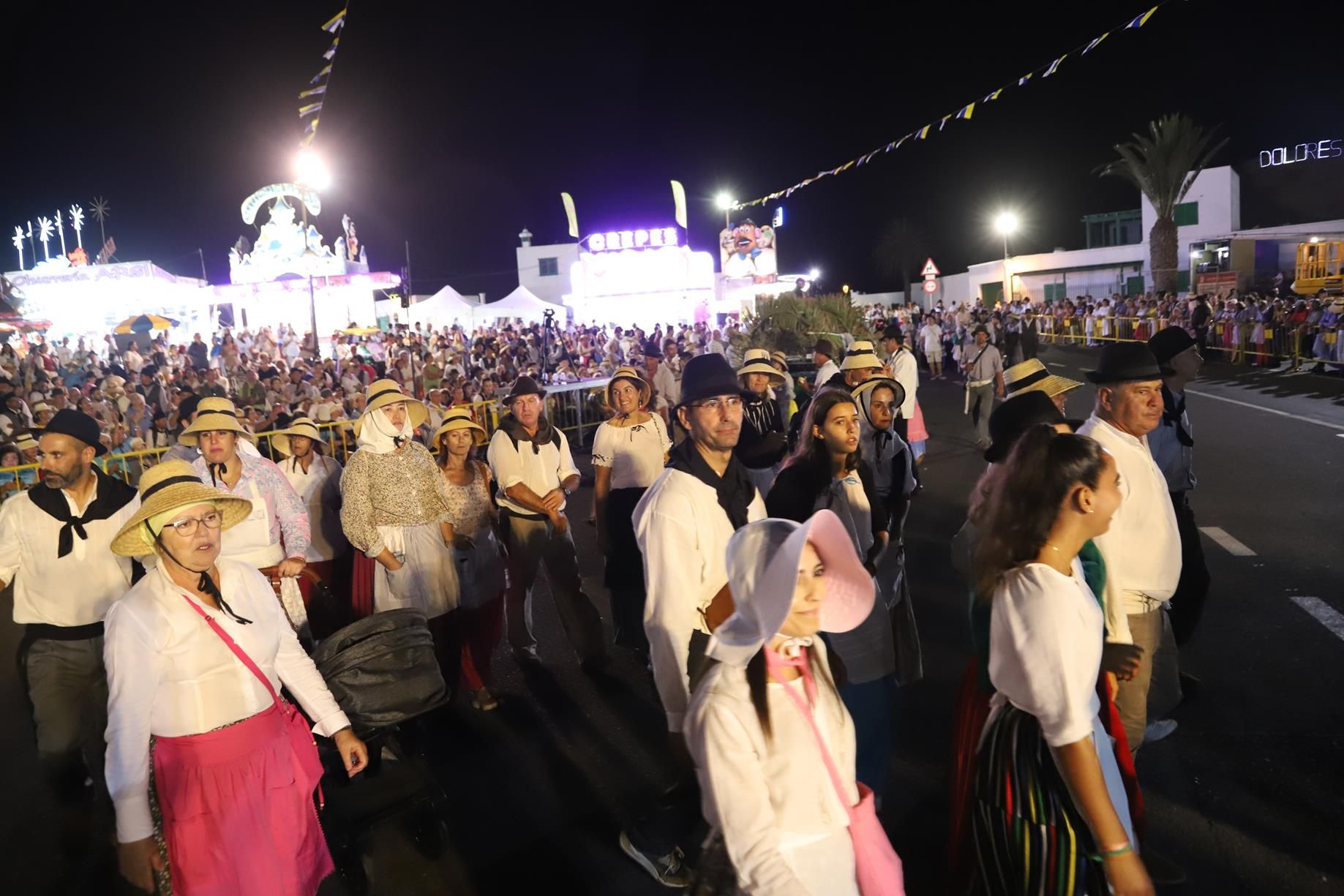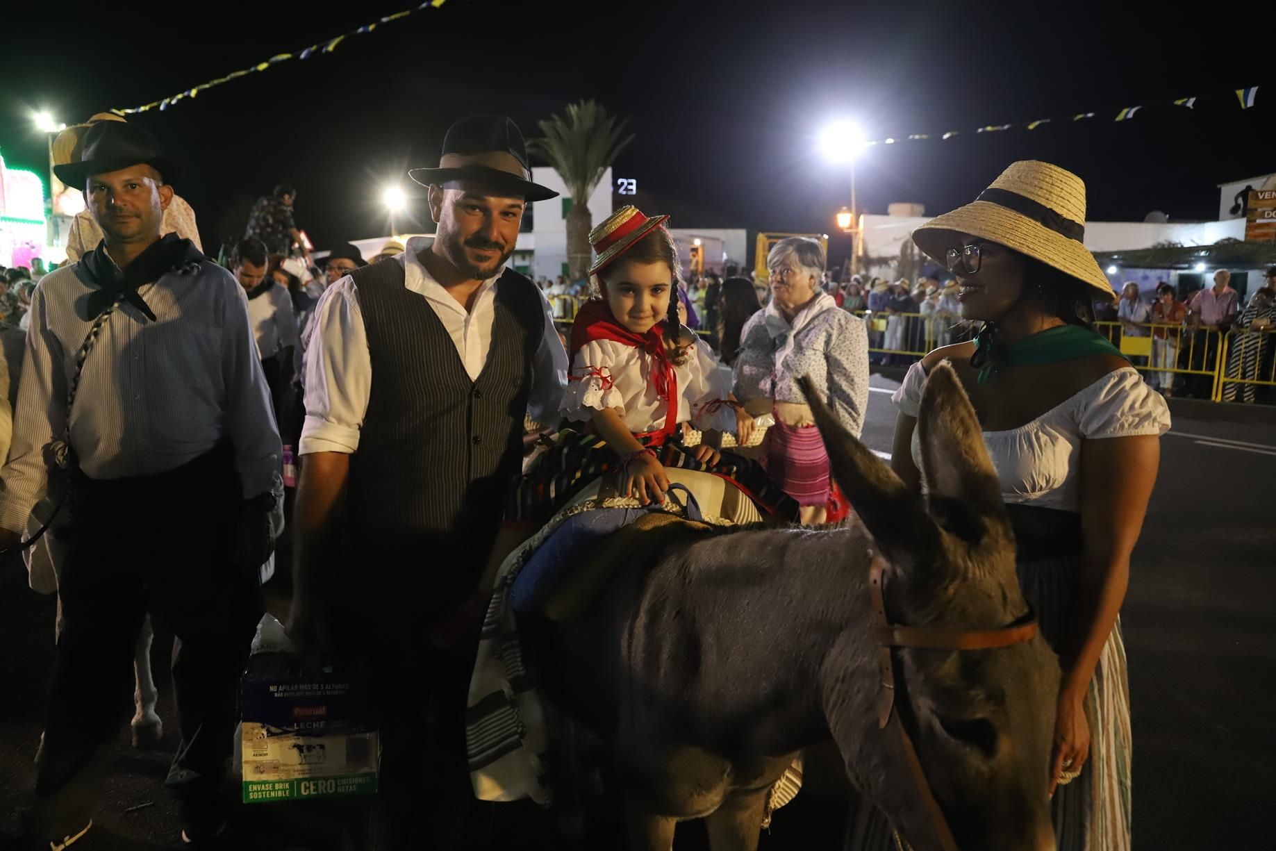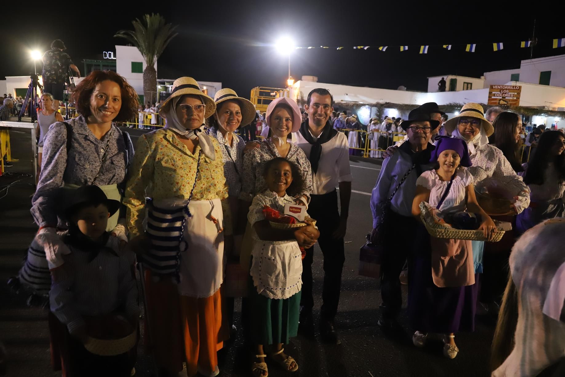 Tras ellos seguía la carroza del ayuntamiento de Tinajo con la ofrenda institucional de la corporación y Cabildo de Lanzarote. Entre las autoridades que en esta edición se acercaron a Dolores, se encontraba el presidente del Cabildo de Lanzarote, Oswaldo Betancort, la presidenta del Parlamento, Ástrid Pérez, la consejera de Cultura del Gobierno de Canarias, Migdalia Machín, parlamentarios, y todos los alcaldes de la isla. De esta manera comenzaba oficialmente el multitudinario desfiles de romeros los cuales cargados de grandes cantidades de productos no perecederos fueron llegando sin parar durante dos horas y media.