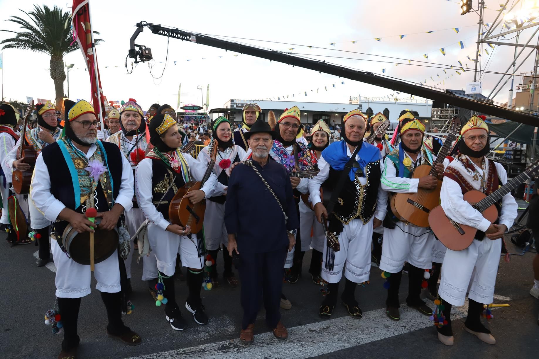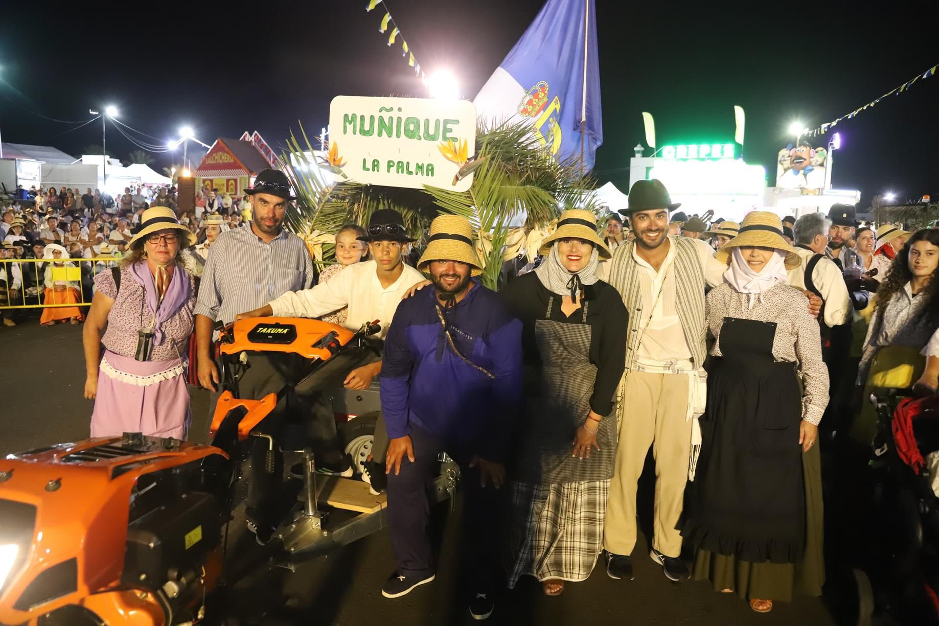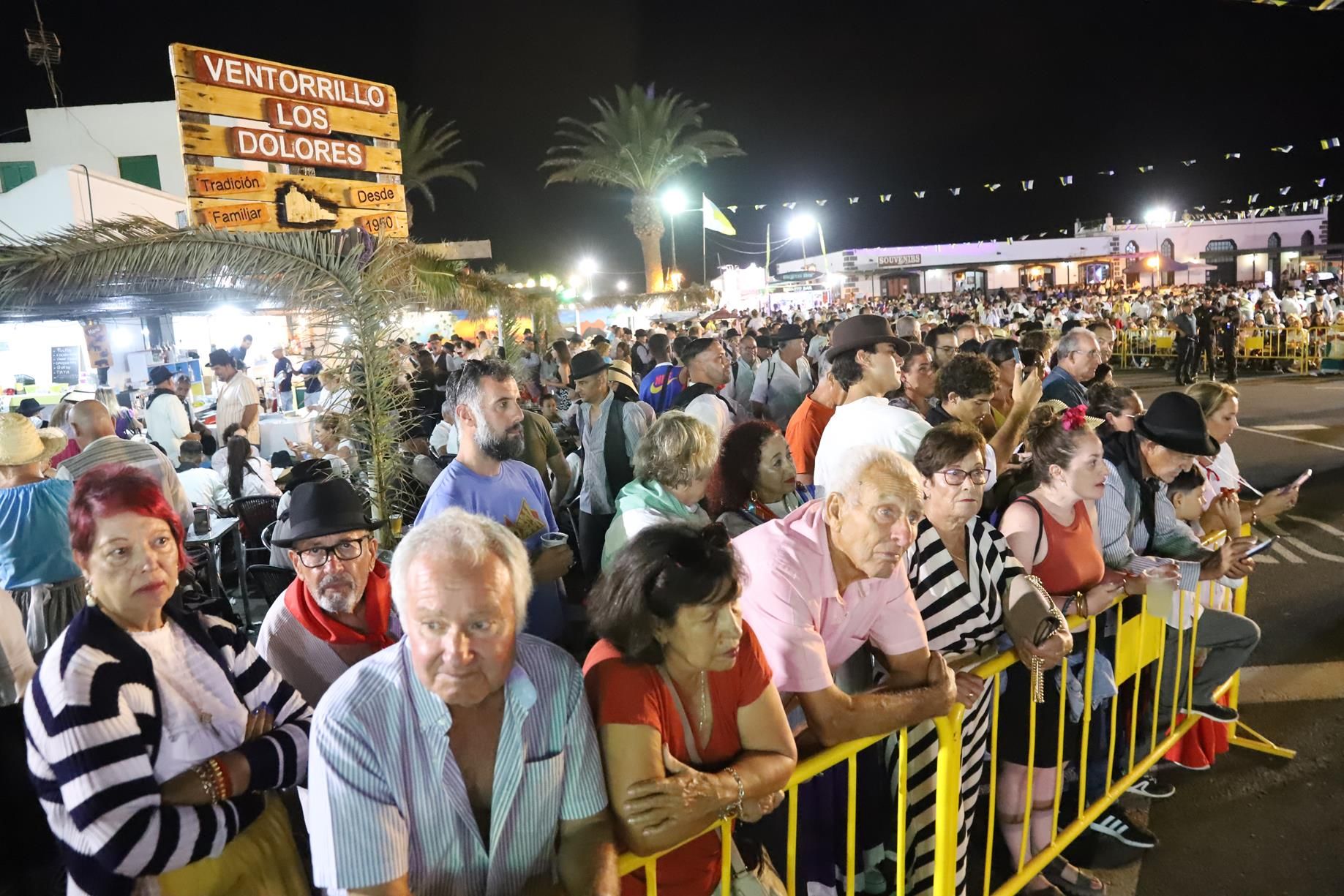 Tras ellos seguía la carroza del ayuntamiento de Tinajo con la ofrenda institucional de la corporación y Cabildo de Lanzarote. Entre las autoridades que en esta edición se acercaron a Dolores, se encontraba el presidente del Cabildo de Lanzarote, Oswaldo Betancort, la presidenta del Parlamento, Ástrid Pérez, la consejera de Cultura del Gobierno de Canarias, Migdalia Machín, parlamentarios, y todos los alcaldes de la isla. De esta manera comenzaba oficialmente el multitudinario desfiles de romeros los cuales cargados de grandes cantidades de productos no perecederos fueron llegando sin parar durante dos horas y media.