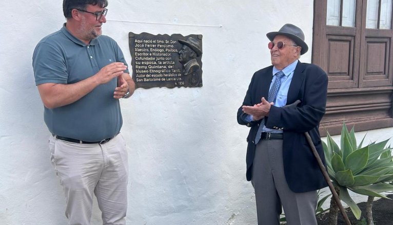 El museo Tanit de San Bartolomé celebró este jueves un emotivo acto de homenaje a Don José Ferrer Perdomo con motivo de su 89 cumpleaños. En el exterior de su casa natal se descubrió una placa conmemorativa que reconoce su extensa labor como maestro, enólogo, político, escritor e historiador, además de destacar su papel como cofundador —junto a su esposa, la artista Remy Quintana— del Museo Etnográfico Tanit y como autor del escudo heráldico del municipio.