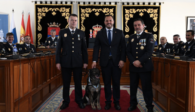 El alcalde Yonathan de León, acompañado por el subcomisario jefe de la Policía Local, y el responsable del Equipo Policial Canino de la Policía Local, entregó la ‘medalla a los méritos policiales’.