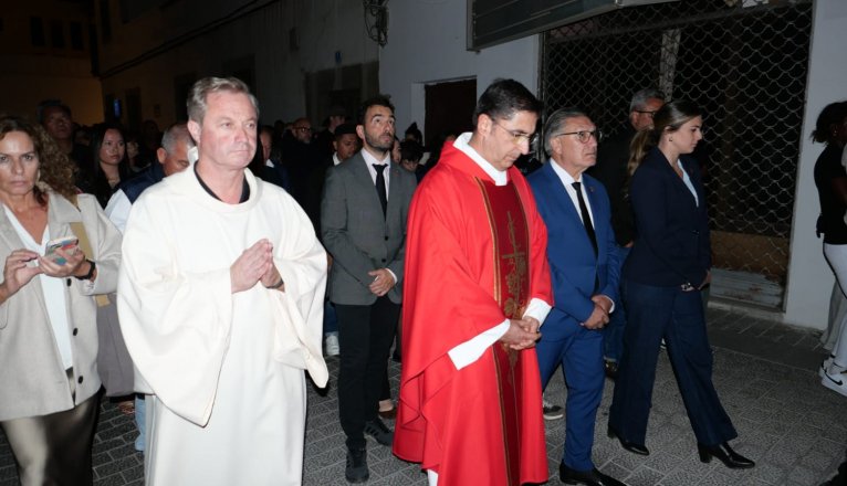 A continuación, el trono con la imagen del Cristo Yacente, junto a el sacerdote celebrante, y después el trono con la imagen de Nuestra Señora de Los Dolores, muy arropada por los feligreses, que no dejaban de disparar sus móviles inmortalizando el momento mientras otros se arrodillaban a su paso.