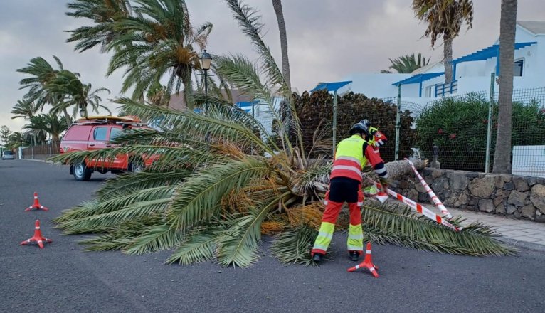 Esta situación meteorológica ha obligado a los bomberos del Consorcio a intervenir en varias incidencias. Por un lado, acudieron a un complejo hotelero de Playa Blanca por una palmera que se había caído a causa del fuerte viento. A la llegada de los efectivos, la Policía Local ya había balizado la zona a la espera de que la retiraran.