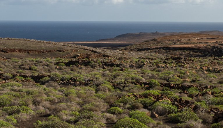 El paso de la borrasca Bram, el 10 de diciembre, y la borrasca Emilia, entre el 12 y el 14, dejó precipitaciones constantes en Lanzarote y tiñó sus campos y volcanes de verde.