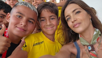 Como puedo apreciarse en la imagen, la presentadora se ha fotografiado con niños y niñas que han acudido a jugar al campo.