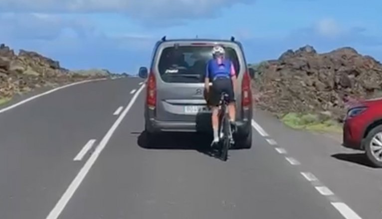 Un ciclista realiza una peligrosa maniobra mientras está circulando por una carretera de Lanzarote. En unas imágenes que se han viralizado en redes sociales se puede ver cómo el deportista se coloca detrás de un vehículo de alquiler y va muy cerca del turismo durante todo el camino.