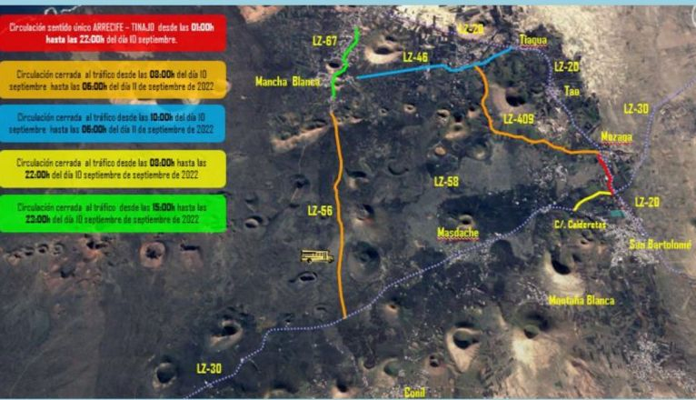 Se cerrará al tráfico el carril sentido a Arrecife, desde la rotonda de Mozaga hasta la rotonda del Monumento, desviando el tráfico por Mozaga, desde las 01:00 horas del día 10/09/22 hasta las 22:00 horas del día 10/09/22.