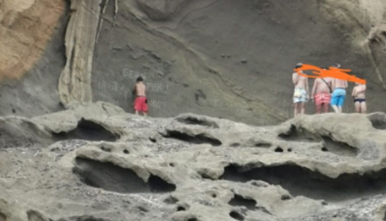 En unas imágenes que ha publicado, se ve a un joven grabando nombres en la piedra del conjunto volcánico de la octava, mientras otros cuatro le observan.
