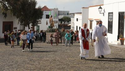 El párroco titular, Matías Gula llevó a cabo la bendición de los ramos de olivo y los palmitos junto a la iglesia del Cristo de la Vera Cruz. Unos palmitos que habían sido confeccionados en el taller organizado por la Federación de Asociaciones Folclóricas y Culturales de Teguise.