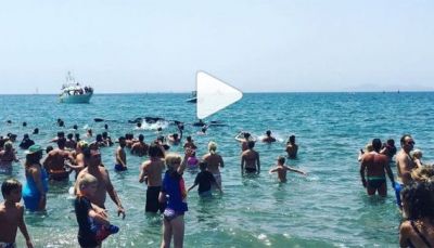 La playa de Las Coloradas de Papagayo ha sido testigo este jueves de un episodio insólito. Hasta allí han llegado entre 12 y 20 cetáceos, calderones tropicales concretamente, que han aparecido a apenas unos 5 metros de la costa. De hecho, estaban a punto de encallar en la orilla, pero decenas de bañistas que se encontraban en la zona lo han evitado.