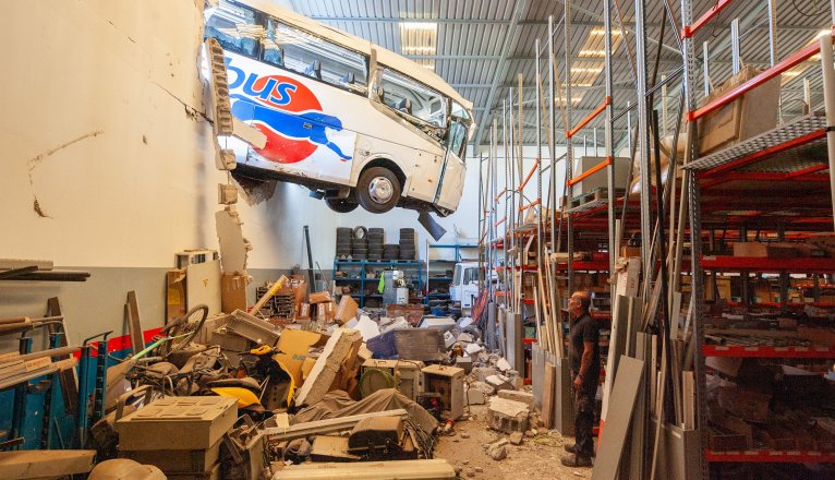 Tras recorrer varios metros fuera de la nave, el vehículo terminó empotrado contra otra nave cercana, donde quedó encajado en la estructura, con parte de la guagua suspendida, lo que evidenció la violencia del impacto y obligó a asegurar la zona.
