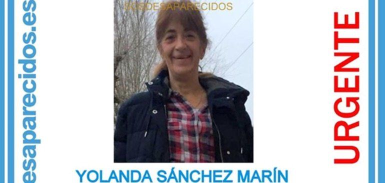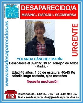 Según la Asociación SOS Desaparecidos, Yolanda Sánchez Marín fue vista por última vez en la localidad madrileña de Torrejón de Ardoz. Mide 1,55 metros de altura, pesa entre 40 y 45 kilogramos, tiene el cabello largo de color castaño y los ojos también castaños y necesita medicación.