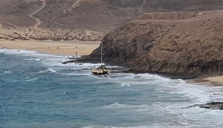 Un catamarán ha encallado este martes en Papagayo, tal y como se muestra en unas imágenes grabadas por una testigo de los hechos, que destaca el fuerte oleaje y viento que hay en la zona.
