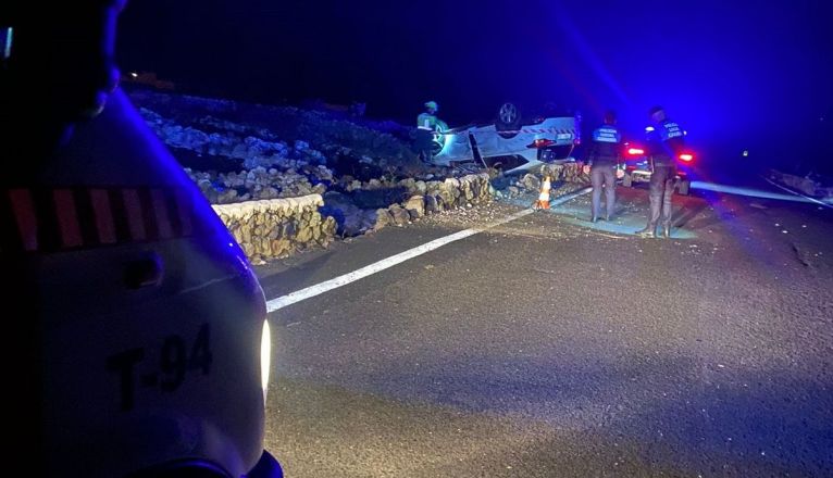 En la madrugada del pasado domingo, un coche volcó en la carretera de Masdache en Tías. Alertados por la Policía Local, los bomberos voluntarios Boluntis se acercaron a la carretera para asistir y supervisar la zona tras el accidente.