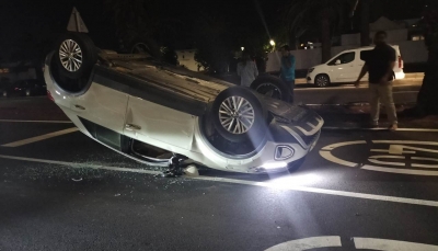 Un coche ha volcado este martes tras chocar con otro vehículo en la Avenida de las Palmeras en Costa Teguise. El accidente ha tenido lugar sobre las 21.40 horas cuando ha sido alertado el CECOES.