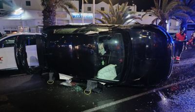 Una mujer resultó herida en la noche de este jueves en un accidente con cuatro vehículos implicados en Costa Teguise, según ha informado el Consorcio de Emergencias. Uno de los coches volcó debido al impacto y quedó en medio de la vía.