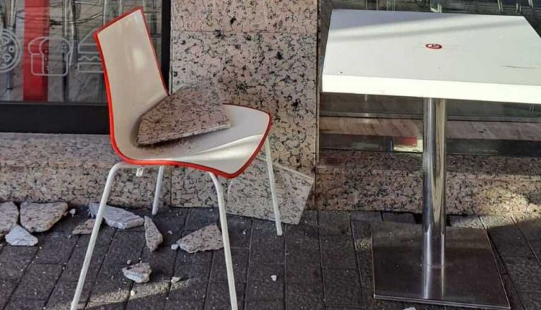Posteriormente, los bomberos revisaron el estado de la fachada y retiraron diversas placas con riesgo de caída. Además, recomendaron al establecimiento que cierre temporalmente sus puertas ante el riesgo de desprendimiento de otra losa.