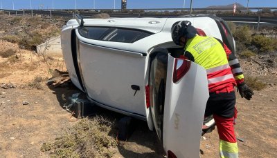 Una mujer ha resultado herida leve tras salirse de la vía con su vehículo y volcar sobre las 13.50 horas de este domingo en la carretera LZ-701, a la altura de la gasolinera cercana a las Salinas de Janubio, según ha informado el Consorcio de Emergencias.
