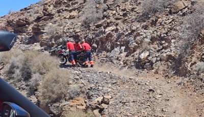Los bomberos acompañados por dos sanitarios entran con dos todoterrenos por la parte de Femés siguiendo la pista hacia Papagayo a la altura de la Playa de la Fuentecita. Allí los efectivos de emergencias han encontrado la moto y unos 300 metros más adelante al motorista que había caminado hacia Papagayo.