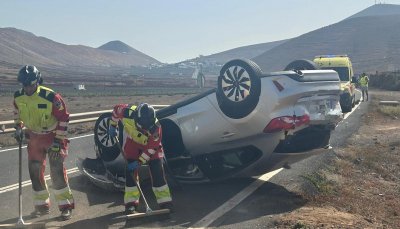 El siniestro tuvo lugar este martes, a las 16.50 horas de la tarde, en la carretera general de Femes a Las Casitas, en el municipio de Yaiza. Según ha informado el dueño de la microguagua a La Voz, su vehículo estaba estacionado en la zona, cuando fue colisionado por el vehículo que acabó volcando.