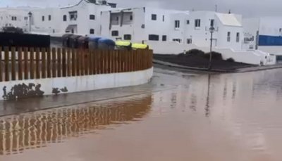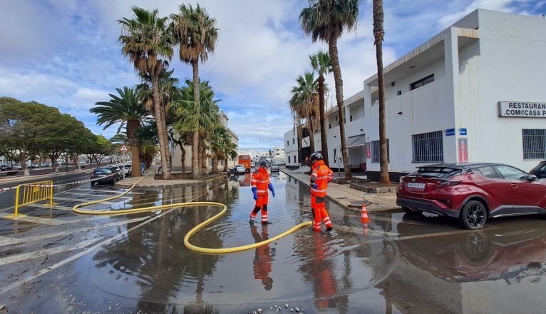 Entre las incidencias que atendieron, los bomberos se trasladaron hasta La Santa, alertados por la inundación de la Avenida El Marinero. La vía principal de este pueblo de Tinajo estaba completamente inundado. A su llegada, achicaron el agua para dejar la carretera en condiciones para circular.