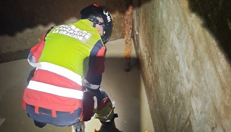 Bomberos del Consorcio de Seguridad y Emergencias de Lanzarote han rescatado en la mañana de este miércoles a un presa canario, un perro de 40 kilogramos, que se había caído en un aljibe en la calle El Sara de Arrecife.