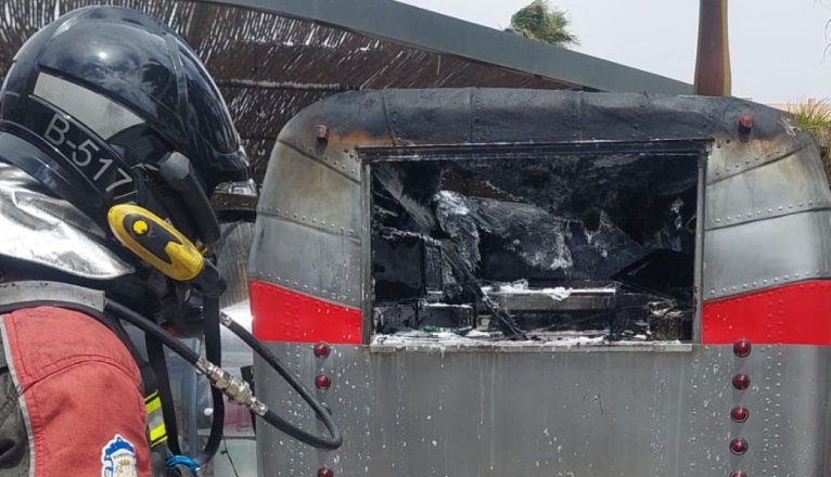 El Consorcio de Seguridad y Emergencias de Lanzarote intervino en la tarde de este jueves 9 de abril tras ser alertado por el CECOES de un incendio en una food truck situada en los jardines de la plaza exterior del Barceló Lanzarote Active Resort, en la avenida del Mar, en Costa Teguise.