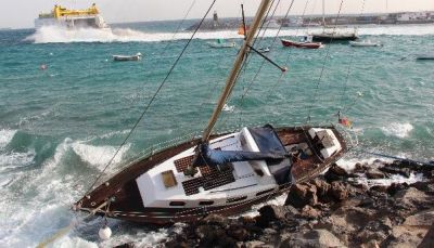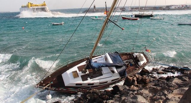 Un velero de 9 metros de eslora, que estaba fondeado sin ocupantes enfrente de la playita de piedra contigua al puerto de Playa Blanca, fue arrastrado este jueves por la acción del fuerte viento, que lo llevó hasta la orilla, quedando empotrado a pie del paseo marítimo sureño.