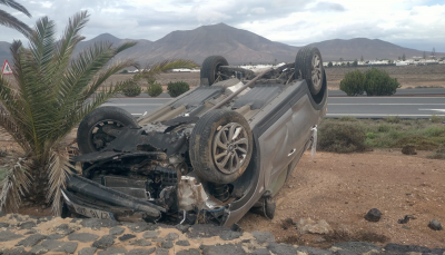Una conductora resultó ilesa tras salirse de la vía y volcar con su vehículo en la carretera que va desde Las Breñas a Playa Blanca la pasada madrugada, según ha informado el Ayuntamiento de Yaiza.