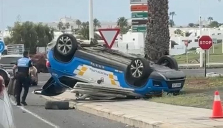 Un coche de la Policía Local de Tías ha volcado en la mañana de este viernes en la carretera de acceso al Rancho Texas, en Puerto del Carmen, según ha confirmado el CECOES.