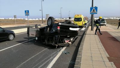 Un vehículo ha volcado en la tarde de este sábado en la rotonda de Tahíche. El accidente ha tenido lugar sobre las 17.40 horas, momento en el que fue alertado el Cecoes.