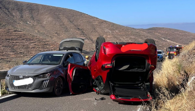 Un coche volcó tras chocar con otro sobre las 17.30 horas de este viernes en la carretera LZ-207 de Tabayesco, según ha informado el Consorcio de Emergencias.