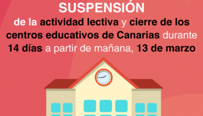 La Consejería de Sanidad del Gobierno de Canarias, en coordinación con la Consejería de Educación, Universidades, Cultura y Deportes, ha ordenado la suspensión de la actividad lectiva y el cierre de los centros educativos durante 14 días, a partir de este viernes 13 de marzo.