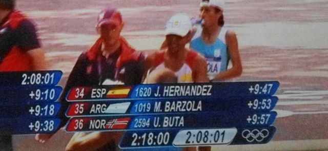 Pasada ya media hora de la prueba, Hernández había conseguido remontar seis posiciones, pasando al puesto número 52, y adelantando incluso a otro de los españoles, Ignacio Cáceres. El otro español, Carles Castillejo, iba en la posición 37. La carrera estaba encabezada por dos keniatas y un etíope.