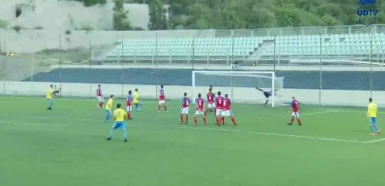 La UD, no se rindió y lo siguió intentando pese a la adversidad del resultado. Así en el minuto 46 de partido, poco antes de que se llegara al descanso, una falta lateral ejecutada por Nico González era rematada por el capitán rojillo, Rosmen Quevedo. El balón se introducía en el fondo de las mallas. Era el 1-1. Con este resultado concluirían los primeros 45 minutos.