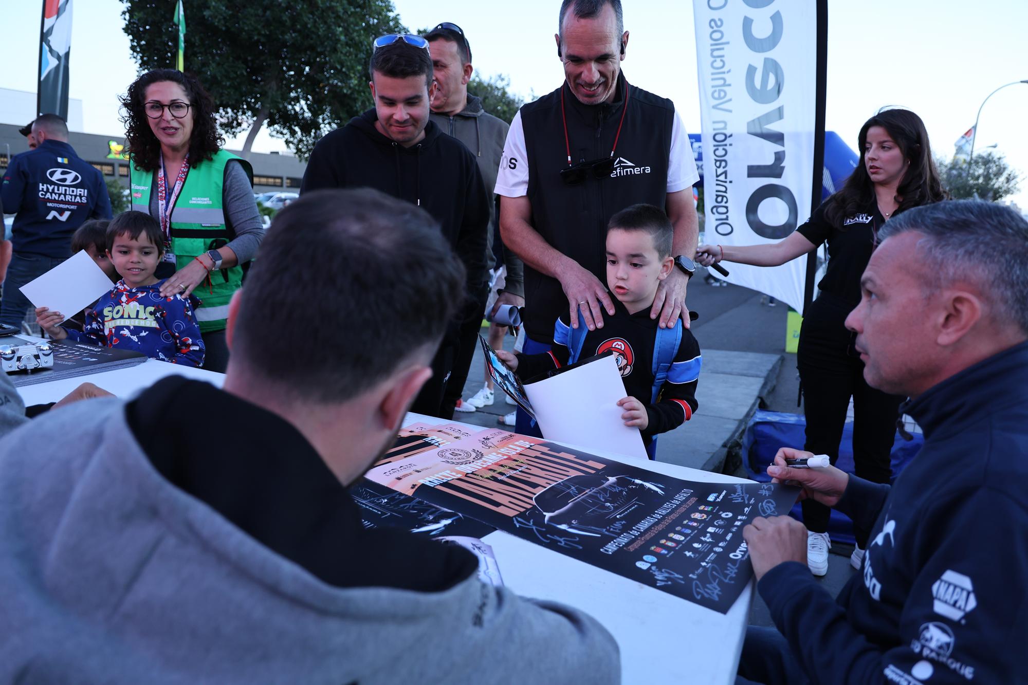 Momentos antes, los ocho equipos con coches tipo Rally2 y favoritos al triunfo en el Rallye Orvecame, con sus pilotos y copilotos, tuvieron un contacto previo con el público y firmaron autógrafos para todos los que se acercaron a la mesa en la misma rampa de salida. Mucha empatía de todos ellos con los aficionados y mostrándose especialmente simpático, el doble campeón europeo, Alexey Lukyanuk. El organizador de la prueba facilitó los pósters como recuerdo de una 46º edición que ya es histórica por el nivel alcanzado de la lista de participantes.